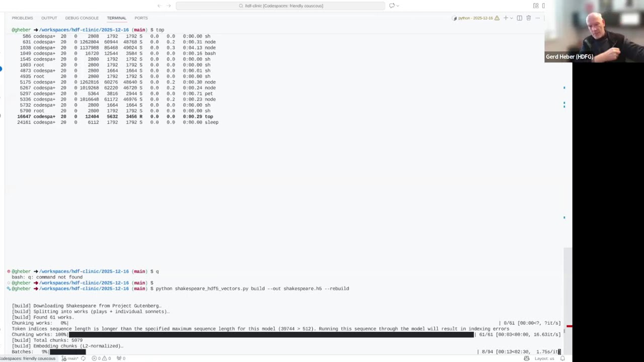 In this 20‑minute HDF Clinic hosted by our very own Gerd Heber, we’ll build a minimal vector database stored entirely in a single HDF5 file: vectors (embeddings) + metadata + similarity search. Using a short Python script, we’ll download the Project Gutenberg Shakespeare corpus, split it into works (and individual sonnets), chunk text by tokens (256 tokens with 32‑token overlap), and generate unit‑normalized embeddings using a SentenceTransformers model. We’ll write the results to an HDF5 layout with compressed datasets for text chunks, work IDs, and embeddings, plus a compact “works index” table for metadata filtering. Finally, we’ll run a few live queries using cosine similarity (implemented as a dot product over normalized vectors, computed in blocks) and discuss practical upgrades, such as richer metadata, better chunking, and adding an approximate nearest neighbor (ANN) index for speed at scale.