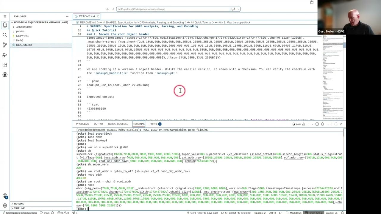 The session will also show how these pickles provide an executable, machine-readable view of HDF5 that is useful for inspection, validation, debugging, and learning the format itself. We will finish by demonstrating a small write-through edit on a disposable copy of an HDF5 file and discussing the care needed when changing metadata directly, including dependent fields such as checksums. This clinic is aimed at developers, advanced users, and anyone who wants a practical introduction to working with HDF5 files from the inside out using GNU poke.