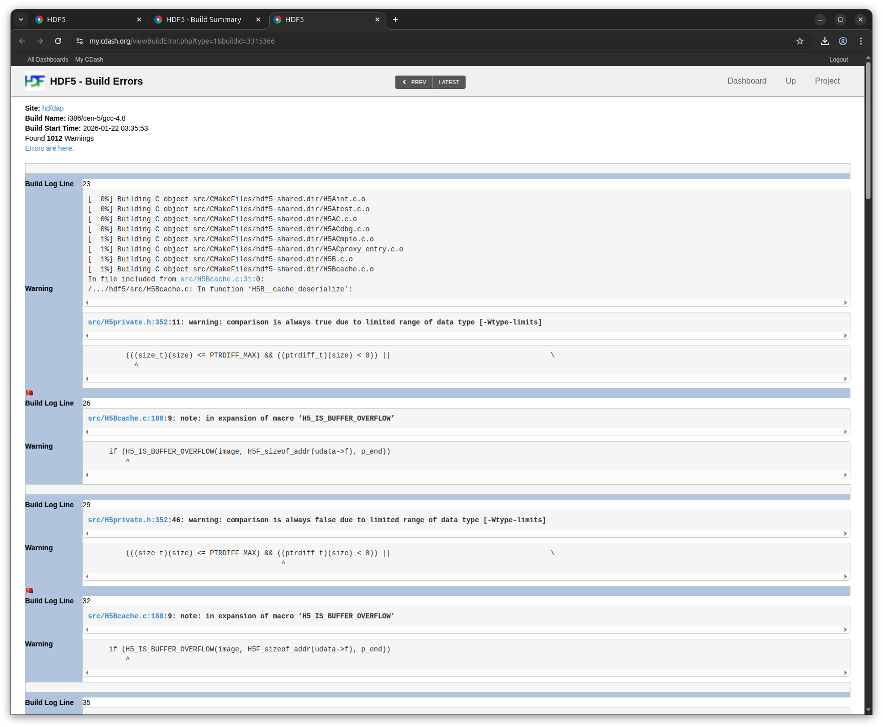 when I click on the following build which has many warnings: